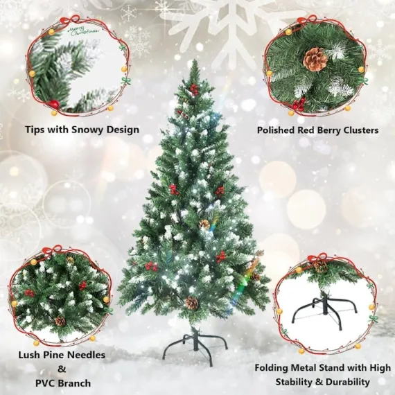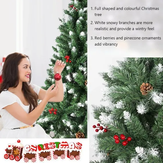 Transformă-ți casa într-un spectacol de sărbătoare cu Bradul Artificial Premium 150cm, decorat cu conuri naturale, merișoare roșii și zăpadă artificială pentru un efect magic de Crăciun.